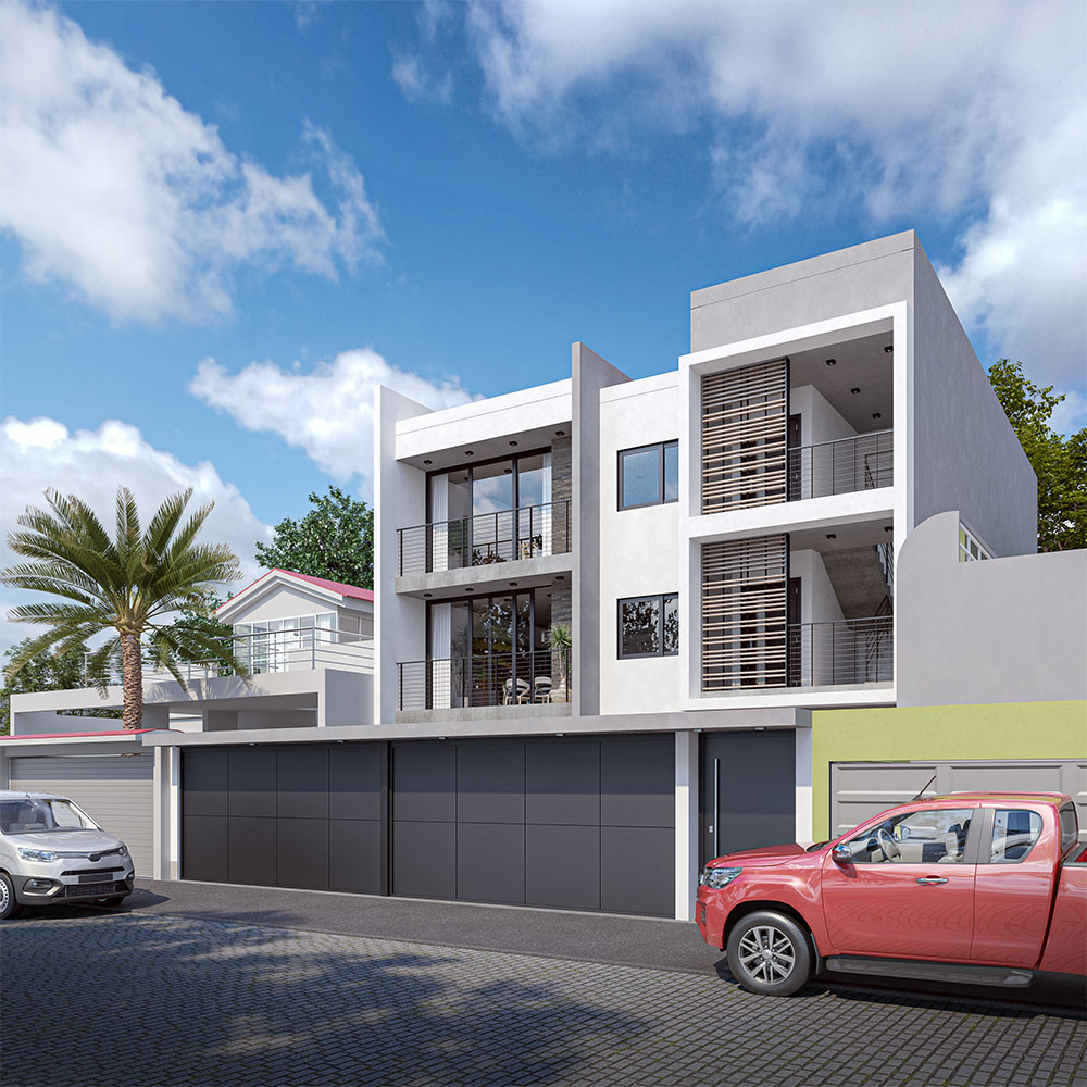 Edificio de departamentos de tres niveles y estacionamiento al frente. Diseño arquitectónico contemporáneo y sofisticado. Diseño sencillo pero elegante y luminoso, con formas limpias y rectas. La entrada peatonal integrada al conjunto de puertas de las cocheras. Alturas generosas, para estos 3 departamentos y una distribución donde la predominante es el amplio espacio, hacen de esta solución arquitectónica, una excelente opción para vivir.